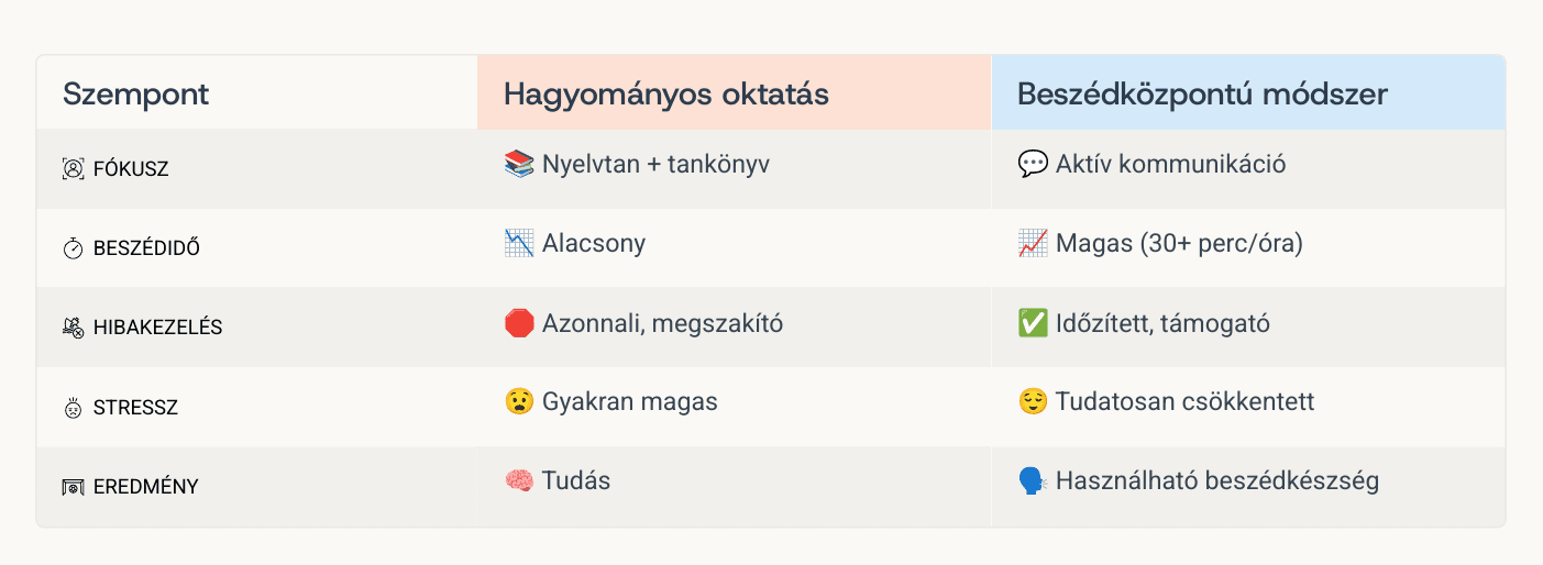 Itt nem csupán módszertani különbségről van szó, hanem arról, hogy a már elsajátított tudás alapvetően passzív marad vagy valódi, használható beszédkészséggé alakul.