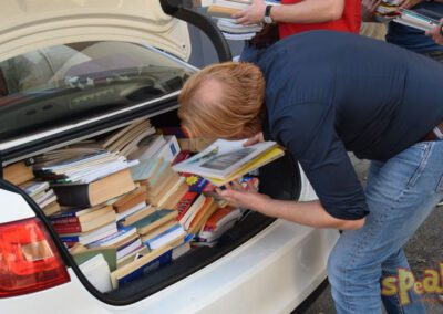 1. lépés: Hozd be régi könyveidet, plüssfiguráidat és/vagy társasjátékaidat hozzánk a Speak! Nyelviskolába, vagy add fel őket postán. Címünk: 1134 Budapest, Klapka u. 11. I. emelet. Hétfőtől csütörtökig 10 és 18,00 óra között tartunk nyitva. Ezenkívül az irodaház recepcióján is le tudjátok adni hétfőtől péntekig 8-18,00 közt az adományokat.(Amennyiben postán adod fel a könyveket kérlek küldd el velük email címed is, hogy el tudjuk juttatni hozzád az ajándékodat!)
