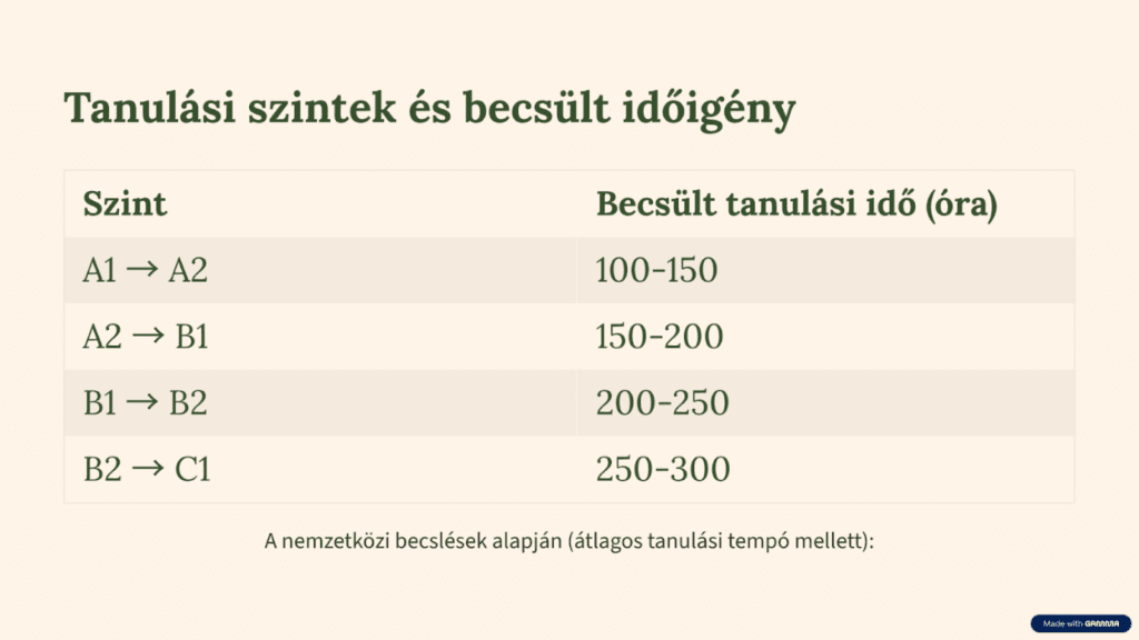 Teljes kezdőként középfokig (B2) egy év alatt csak intenzív, heti 4–5 alkalmas rendszerben érhető el. Alapszintre azonban egy év bőven elegendő rendszeres tanulással.