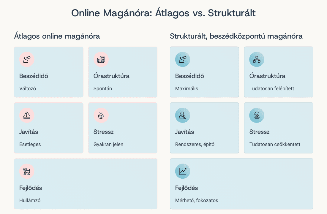 Több ezer főn végzett felmérésünk szerint egy átlagos hagyományos csoportos online órán 2–3 perc aktív beszédidő jut egy főre 45 perc alatt, míg egy strukturált (rendszerezett, logikus felépítésű), beszédközpontú magánórán ez 30–35 perc is lehet.